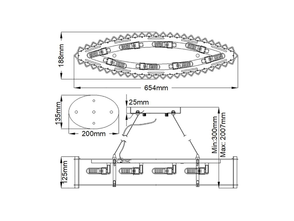 | Méret (mm): | H: 125mm W: 654mm D: 188mm Min/Max Drop: 300mm - 2007mm |