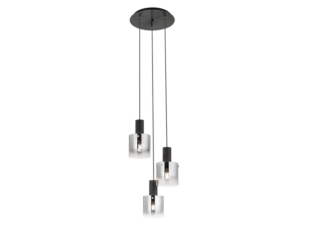 Beltéri modern függeszték, fekete fém és fésült alumínium szerkezet, füst színű üveg. 1x max 42W, E27, 230V, 50Hz.
