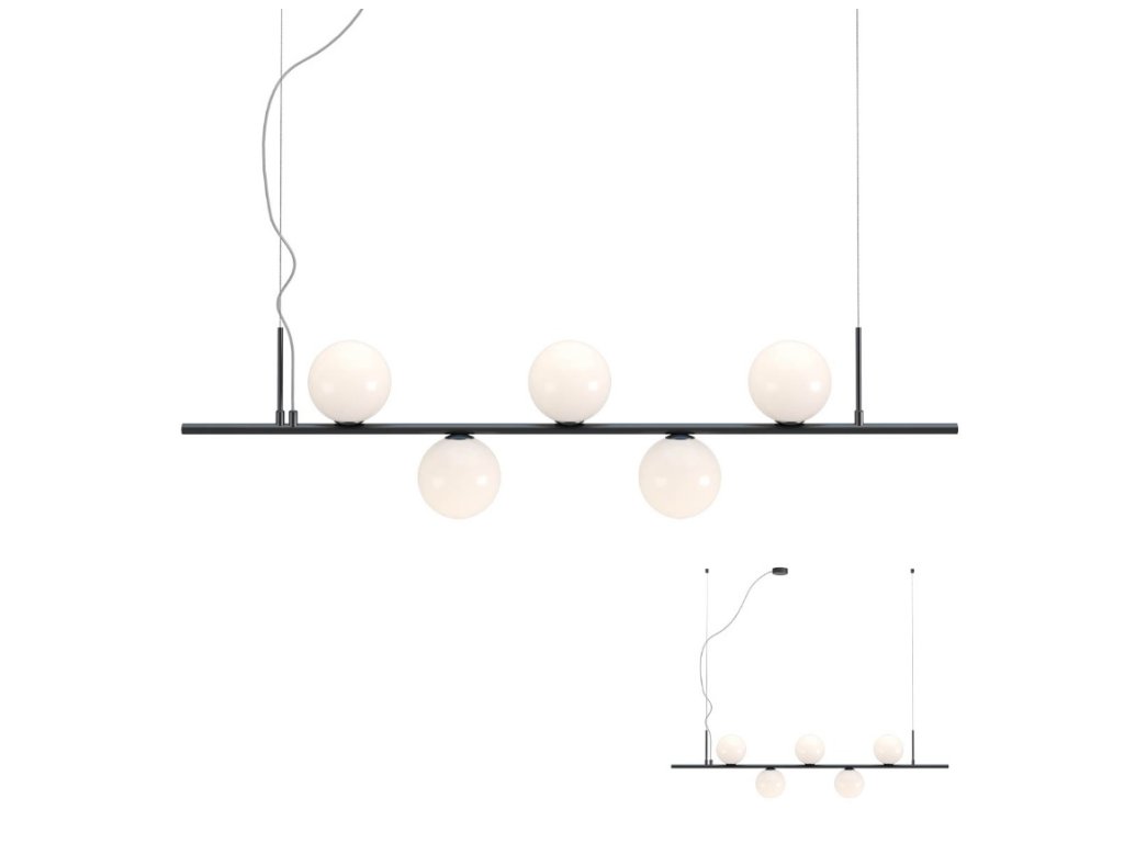 Beltéri modern függeszték lámpa, matt fekete fém szerkezet, fújt üveg opál diszperzór. 6x max 28W, E14, 230V, 50Hz.
