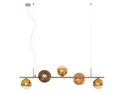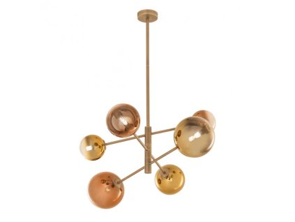 Beltéri függeszték, réz patina fém szerkezet, fényes arany és fényes kávé színű pirex diszperzór. 10x max 10W, G9, 230V, 50Hz.